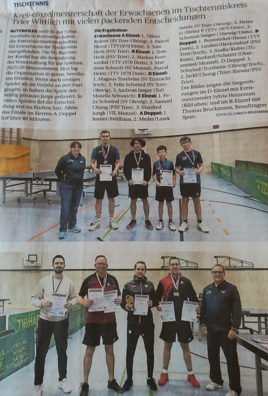 Was als Training unter Wettkampfbedingungen angedacht war, endete mit einem doppelten Triumph. Die Rede ist von Magnus Trusheim, gerade mal 13 Jahre alt, der am 25. Oktober nach einem Trainingslehrgang in Düsseldorf sein Können bei den Herren in der D-Klasse unter Beweis stellte. In vier Partien nur ein Satzverlust - das war eine starke Vorstellung des Irschers in Butzweiler. Diese wurde am Ende mit den Kreismeistertiteln im Einzel und zusammen mit Felix Schwind (SV Olewig) im Doppel belohnt.