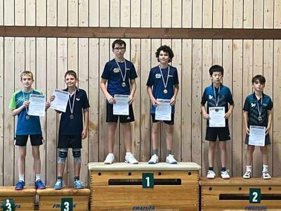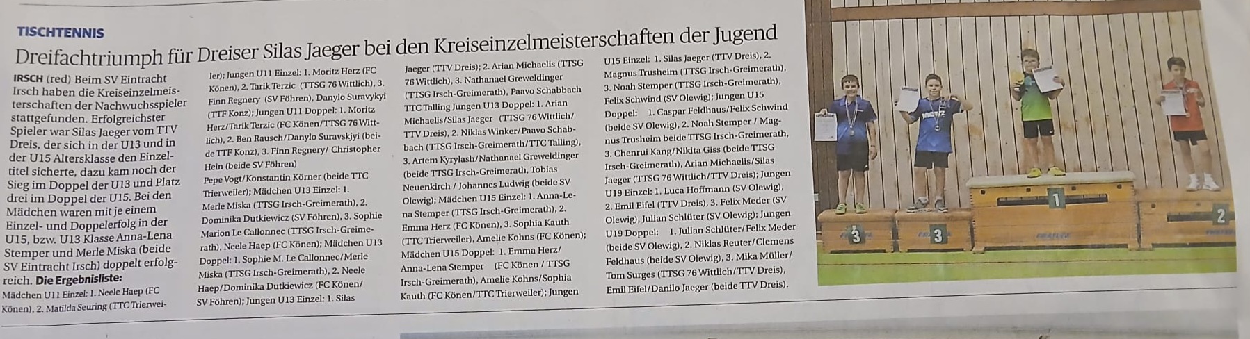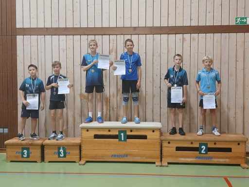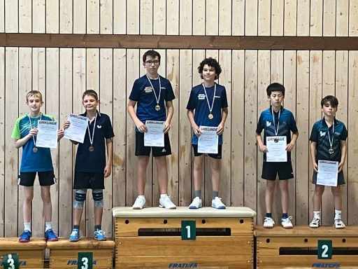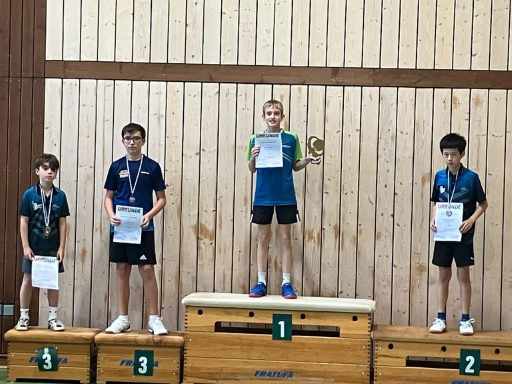 Die meisten Irscher Teilnehmer waren bei den Jungen U15 am Start. Für Ben Weber und Artem Kyrylash war nach der Gruppenphase und der ersten Runde im Doppel das Turnier zu Ende, aber beide machten Ihre Sache gut. Leider hat es auch Chenrui Kang nicht über die Gruppenphase hinaus geschafft, das entscheidende Spiel verlor er gegen seinen Vereinskammeraden Niklas Winkler, der dann knapp im Viertelfinale am späteren Sieger scheiterte, aber trotzdem als Sechster zu den Bezirksmeisterschaften fahren darf. Im Viertelfinale war dann für Henri Neuer gegen Felix Schwind auch etwas unglücklich Endstation, während im vereinsinternen Duell der jüngste Teilnehmer Noah Stemper im fünften Satz gegen Nikita Giss gewann. Im Halbfinale setzte sich dann Magnus Trusheim mit 3:1 gegen Felix Schwind durch, währen Noah Stemper trotz sehr guter Leistung mit 1:3 gegen Silas Jaeger, der dann im Finale Magnus überhaupt keine Chance ließ. Trotzdem kann man sehr zufrieden sein. Magnus, Noah, Henri und Niklas fahren zu den Bezirksmeisterschaften; und auch im Doppel gab es mit Silber für Magnus und Noah und Bronze für Chenrui und Nikita weitere Medaillen.